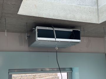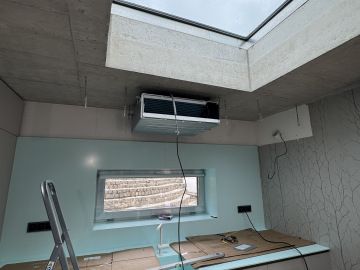V moderním interiéru, kde záleží na každém detailu, jsme zajistili diskrétní chlazení pomocí kanálové jednotky Samsung MSP o výkonu 6,8 kW. Jednotka je elegantně skrytá v podhledu, takže nenarušuje čistý vzhled prostoru a zároveň zajišťuje tiché chlazení celého interiéru. Systém je napojen na chytrou domácnost Loxone, která automaticky reguluje teplotu podle aktuálních podmínek.