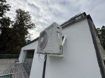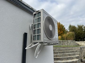 Venkovní jednotka je umístěna na stěně pomocí konzole, což zajišťuje snadný přístup pro servis i tichý provoz.