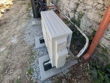 Venkovní jednotka je umístěna na zahradě domu na gumových silentblocích, které tlumí hluk a vibrace. Díky technologii WindFree™ se obyvatelé mohou spolehnout na příjemné klima bez nepříjemného průvanu – ideální řešení pro každodenní komfort v obytném podkroví.