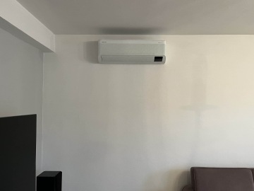 Ve Slavkově jsme instalovali nástěnnou klimatizaci Samsung WindFree™ Avant 3,5 kW, která efektivně chladí i vytápí. Při montáži jsme dbali na čistý vzhled interiéru a minimalizaci viditelné kabeláže. Napájení jsme připojili na zásuvku uvnitř místnosti, přičemž kabel vedl vyvrtaným otvorem ve zdi na fasádu a v tenké liště
