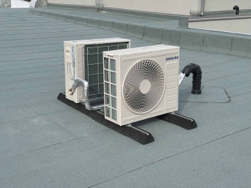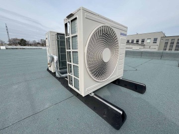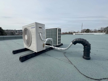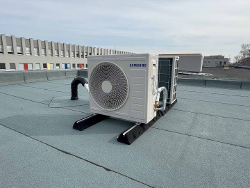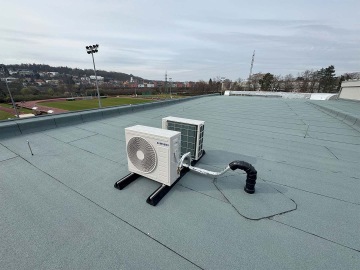 Trasy chladivového potrubí byly vedeny stropem do technického prostoru nad učebnou, odkud je zajištěno napojení na venkovní jednotky umístěné na střeše.