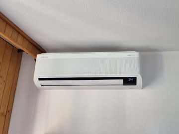 Příklad z Třince: V domě našeho klienta jsme instalovali nástěnnou splitovou klimatizaci Samsung WindFree™ Avant. Ta je přímo napájena přebytky z FVE, příčemž efektivně chladí obývací pokoj. Venkovní jednotka, umístěná na konzoli, je esteticky propojena s vnitřní jednotkou skrytými lištami.