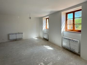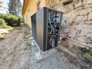 U Trhových Svinů jsme instalovali tepelné čerpadlo Samsung EHS Mono HT Quiet o výkonu 14 kW. Nový systém nahradil původní lokální kamna a dnes spolehlivě vytápí radiátory i ohřívá teplou vodu pro dům o ploše 280 m². Jedná se o starý kamenný dům s cihlovou přístavbou, bez zateplení, s tepelnou ztrátou 15 kW.
