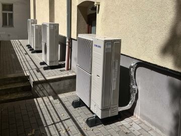 Ve dvoře budovy jsme na speciální gumové bloky umístili čtyři venkovní jednotky – dvě Samsung DVM S Eco HP s výkonem 22,4 kW a dvě Samsung DVM Eco HP & HR s výkonem 12,1 kW. Gumové bloky tlumí hluk a vibrace, takže systém neruší ani při plném výkonu.